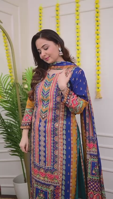 Blue Multicoloured print with Embroidered Kurti with Dupatta and Pant Set