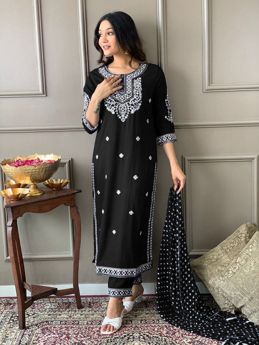 பிளாக் ஹெவி ரேயான் சிக்கன்காரி எம்ப்ராய்டரி குர்தி மற்றும் பிளாஸ்ஸோ செட்