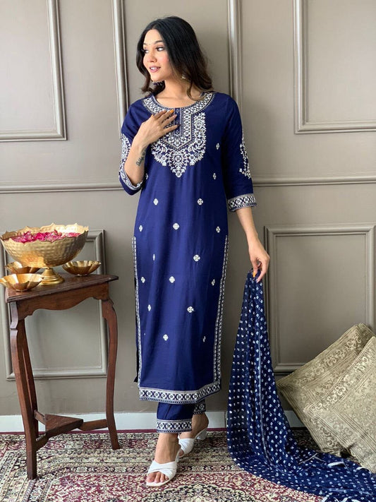 துப்பட்டா மற்றும் பேன்ட்டுடன் கூடிய அடர் நீல நிற ஹெவி ரேயான் ஸ்ட்ரெய்ட் மிரர் ஒர்க் குர்தி