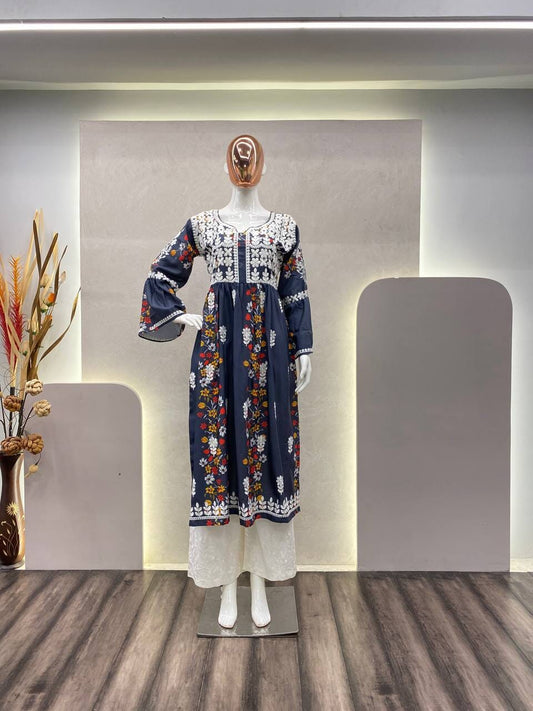 வெள்ளை எம்பிராய்டரி மற்றும் பிளாஸ்ஸோ செட் கொண்ட நீல நிற டிசைனர் ரேயான் குர்தி
