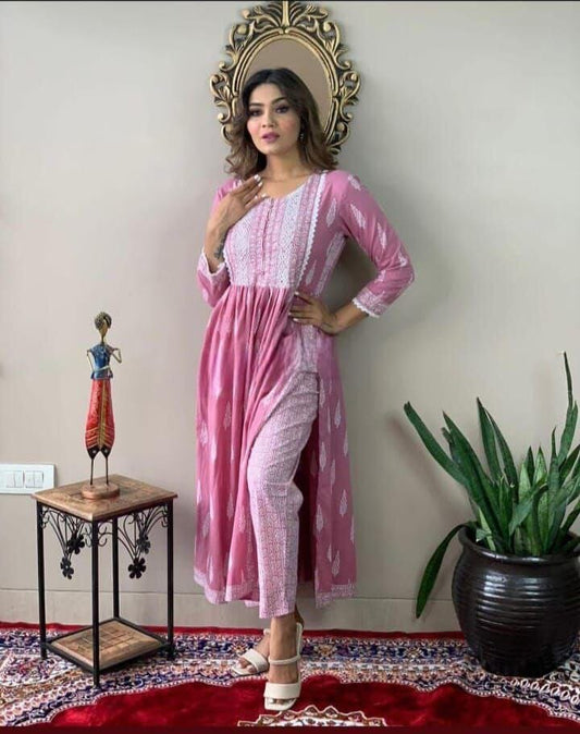 வெளிர் இளஞ்சிவப்பு நைரா கட் எம்பிராய்டரி மற்றும் பிரிண்டட் ரேயான் குர்தி பேன்ட் செட் உடன்