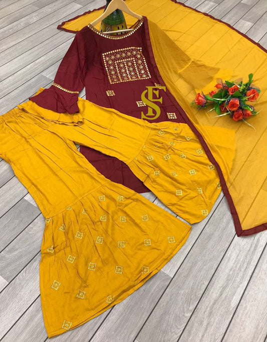 மெரூன் பெல் ஸ்லீவ் ரேயான் ஃபாயில் வேலைப்பாடு எம்பிராய்டரி ஷராரா சூட்
